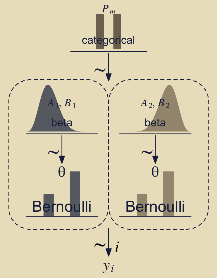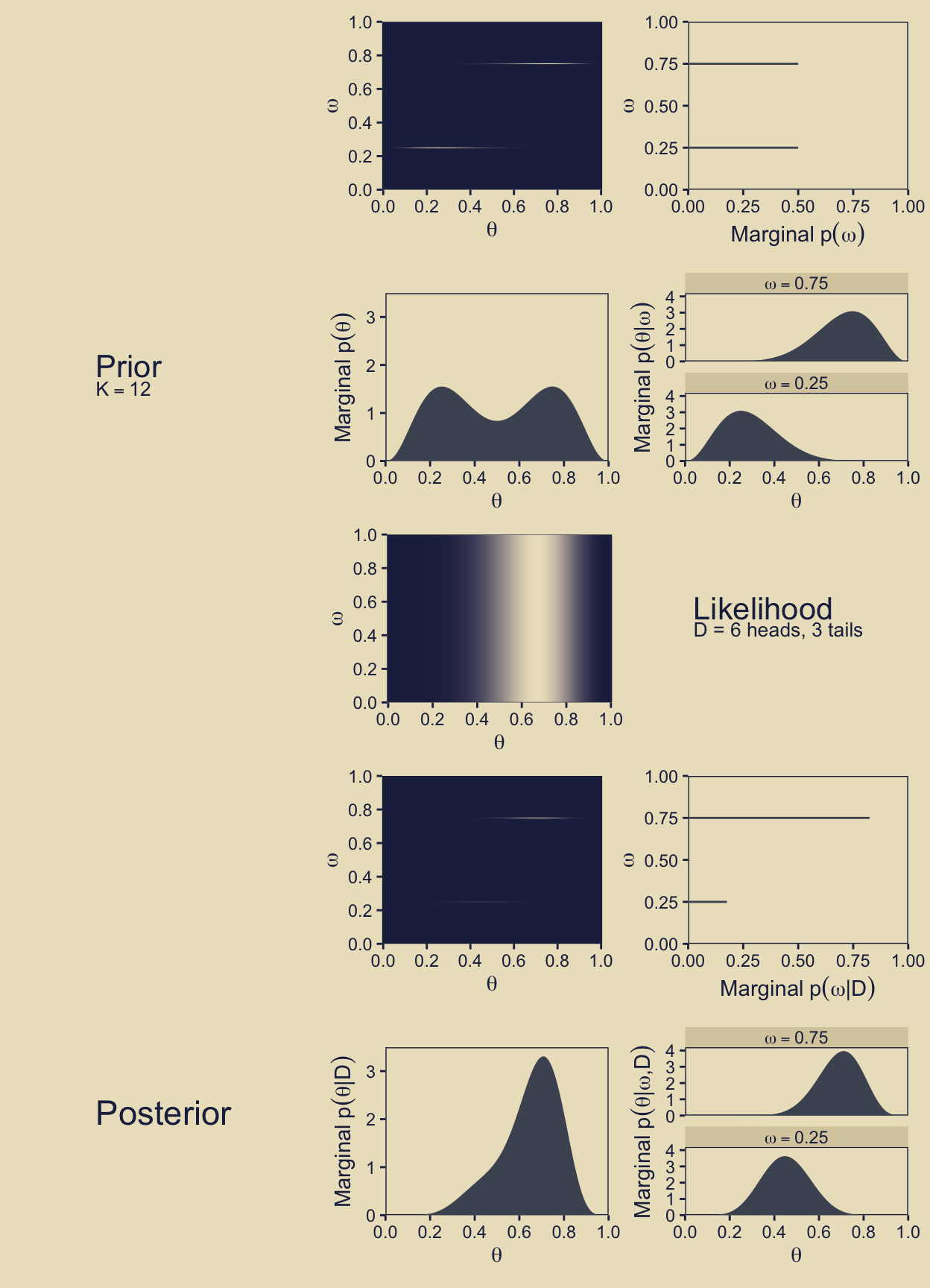 Now we add \(m\), which is a model index where \(m = 1\) stands for the first model, \(m = 2\) stands for the second model, and so on. So when we have more than one model in play, we might refer to the likelihood as \(p_m(y \mid \theta_m, m)\) and the prior as \(p_m(\theta_m \mid m)\). It’s also the case, then, that each model can be given a prior probability \(p(m)\).