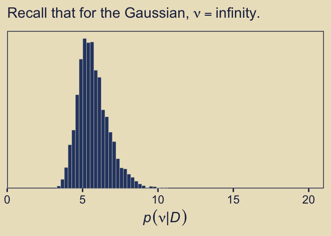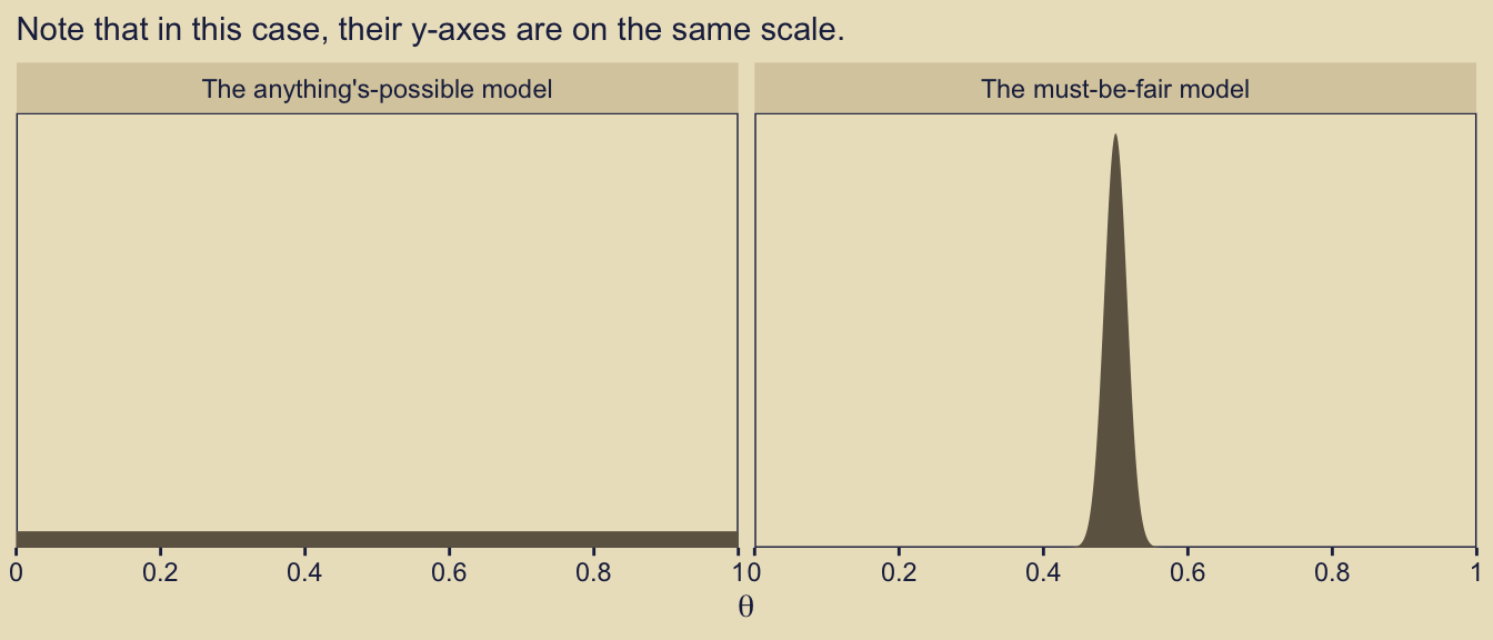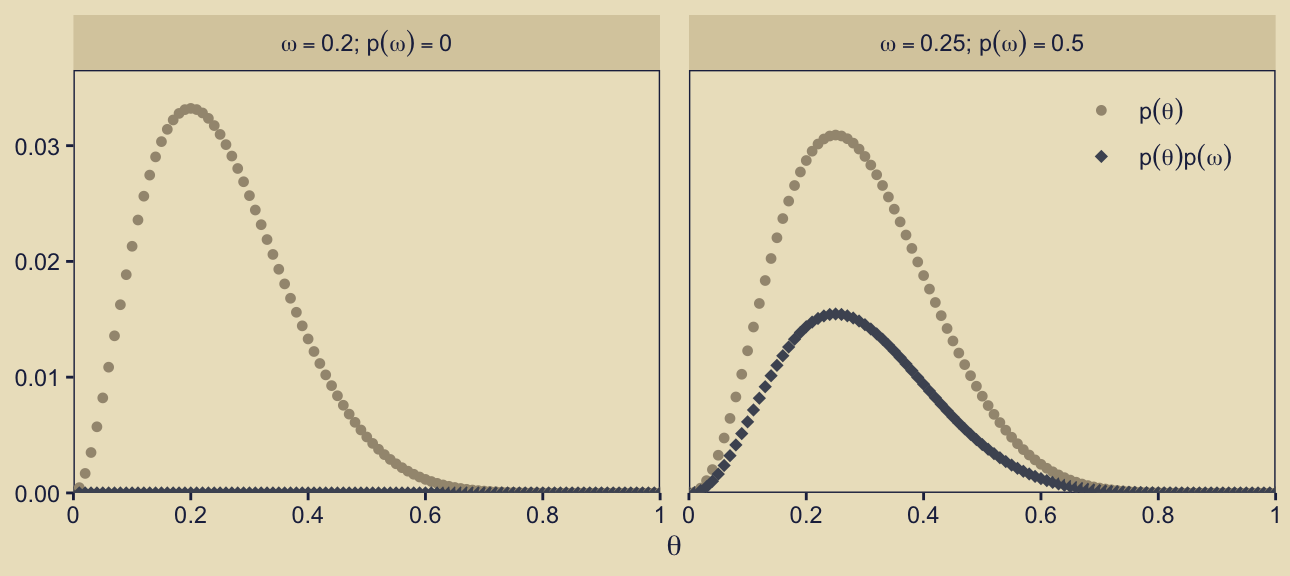 We should also clarify what we mean by a “model.” In Bayesian statistics, the model is the numerator of Bayes’ theorem, \(p(D \mid \theta)\ p(\theta)\). But in this context, we’re not focusing on the realization of \(p(D \mid \theta)\ p(\theta)\) as computed using a real data set. Rather, \(p(D \mid \theta)\ p(\theta)\) is a model in the sense that it may be used as a data-generating function. IMO, Kruschke didn’t sufficiently clarify this point in the text, though he tried to in prose on page 268. After some personal communications with Kruschke, I’m confident this is what he meant.