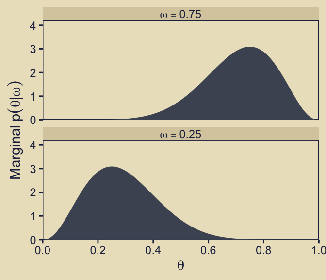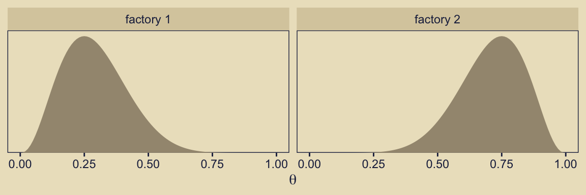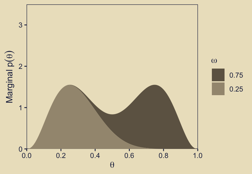 Thus given \(\omega_1 = 0.25\), \(\omega_2 = 0.75\) and \(\kappa = 12\), we can describe the bias of the two coin factories as \(\operatorname{Beta}(\theta_{[m = 1]} \mid 3.5, 8.5)\) and \(\operatorname{Beta}(\theta_{[m = 2]} \mid 8.5, 3.5)\). With a little wrangling, we can use our d tibble to make the densities of Figure 10.2. But before we do, we should discuss plotting.