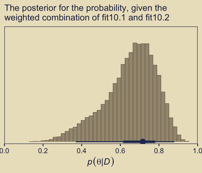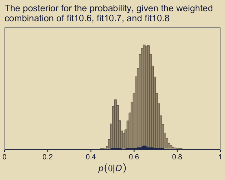 labs(subtitle = "The posterior for the probability, given the weighted\ncombination of fit10.6, fit10.7, and fit10.8")