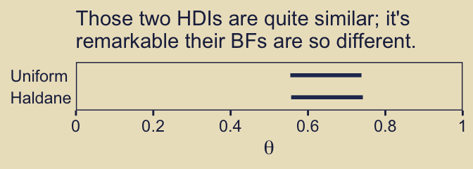 The evidence varied a bit by the specific weighting scheme. Across both, the model with the uniform prior (fit10.7) did arguably the best, but the model with the Haldane prior (fit10.8) was clearly in the running. Overall, the evidence for one versus another was weak.