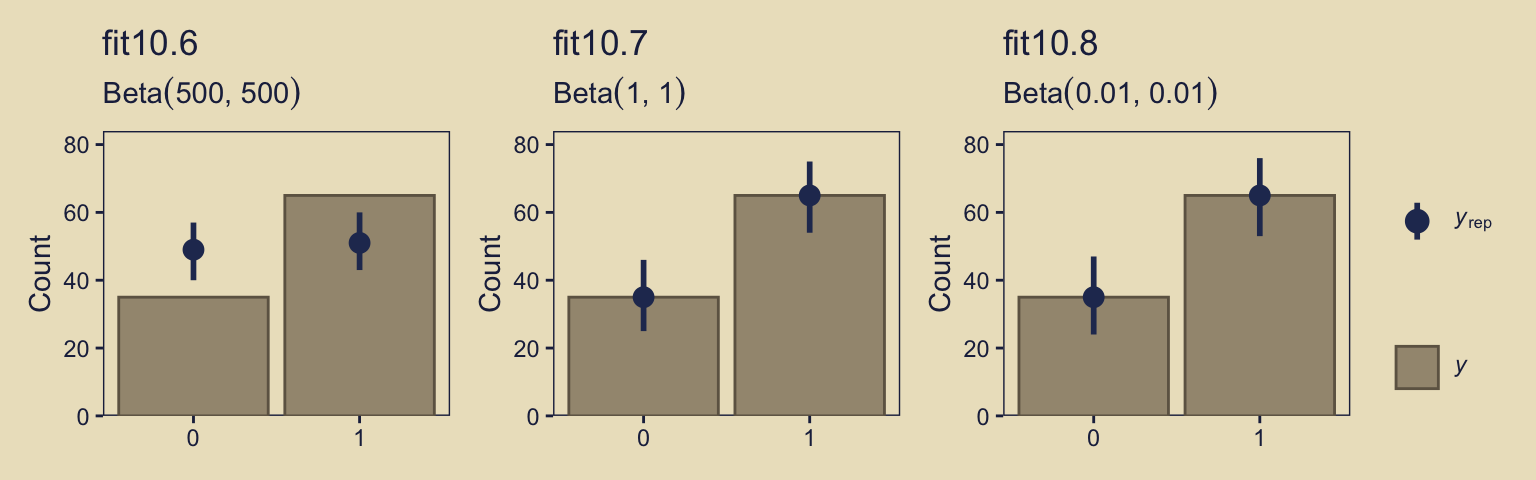 Instead of the default 10, this time we used 1,000 posterior simulations from each fit, which we summarized with dot and error bars. This method did a great job showing how little fit10.6 learned from the data. Another nice thing about this method is it reveals how similar the results are between fit10.7 and fit10.8, the two alternate versions of the anything’s-possible model. Also, did you notice how we used limits = c(0, 80) when combining the plots with patchwork? Holding the scale of the \(y\)-axis constant makes it easier to compare results across plots.