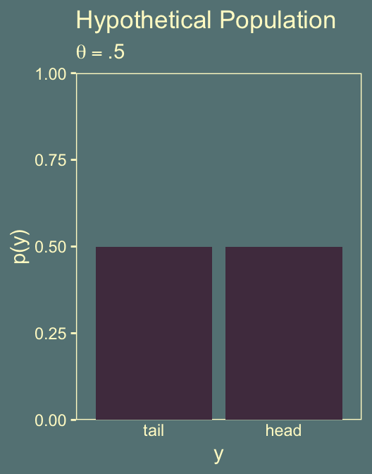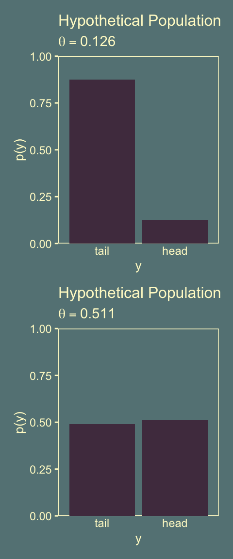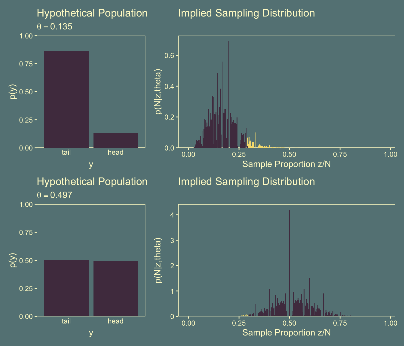“Sampling distributions tell us the probability of imaginary outcomes given a parameter value and an intention, \(p(D_{\theta, I} \mid \theta, I)\), instead of the probability of parameter values given the actual data, \((\theta \mid D_\text{actual})\).”