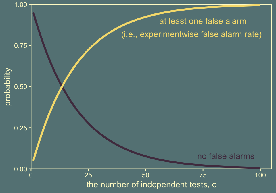 In NHST, we have to take into account all comparisons we intend for the whole experiment. Suppose we set a criterion for rejecting the null such that each decision has a “per-comparison” (PC) false alarm rate of \(\alpha_\text{PC}\), e.g., \(5\%\). Our goal is to determine the overall false alarm rate when we conduct several comparisons. To get there, we do a little algebra. First, suppose the null hypothesis is true, which means that the groups are identical, and we get apparent differences in the samples by chance alone. This means that we get a false alarm on a proportion \(\alpha_\text{PC}\) of replications of a comparison test. Therefore, we do not get a false alarm on the complementary proportion \(1 - \alpha_\text{PC}\) of replications. If we run \(c\) independent comparison tests, then the probability of not getting a false alarm on any of the tests is \((1 - \alpha_\text{PC})^c\). Consequently, the probability of getting at least one false alarm is \(1 - (1 - \alpha_\text{PC})^c\). We call that probability of getting at least one false alarm, across all the comparisons in the experiment, the “experimentwise” false alarm rate, denoted \(\alpha_\text{EW}\). (pp. 325–326, emphasis in the original)