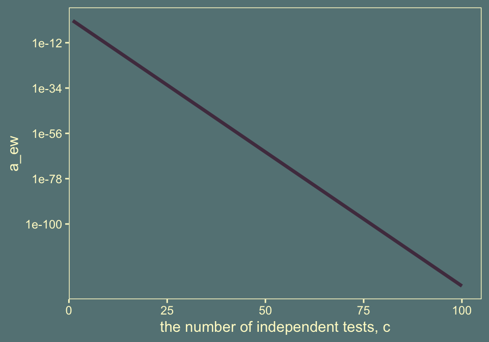 Again, it might be useful to plot the consequence of Bonferroni’s correction on \(\alpha\) for different levels of \(c\).