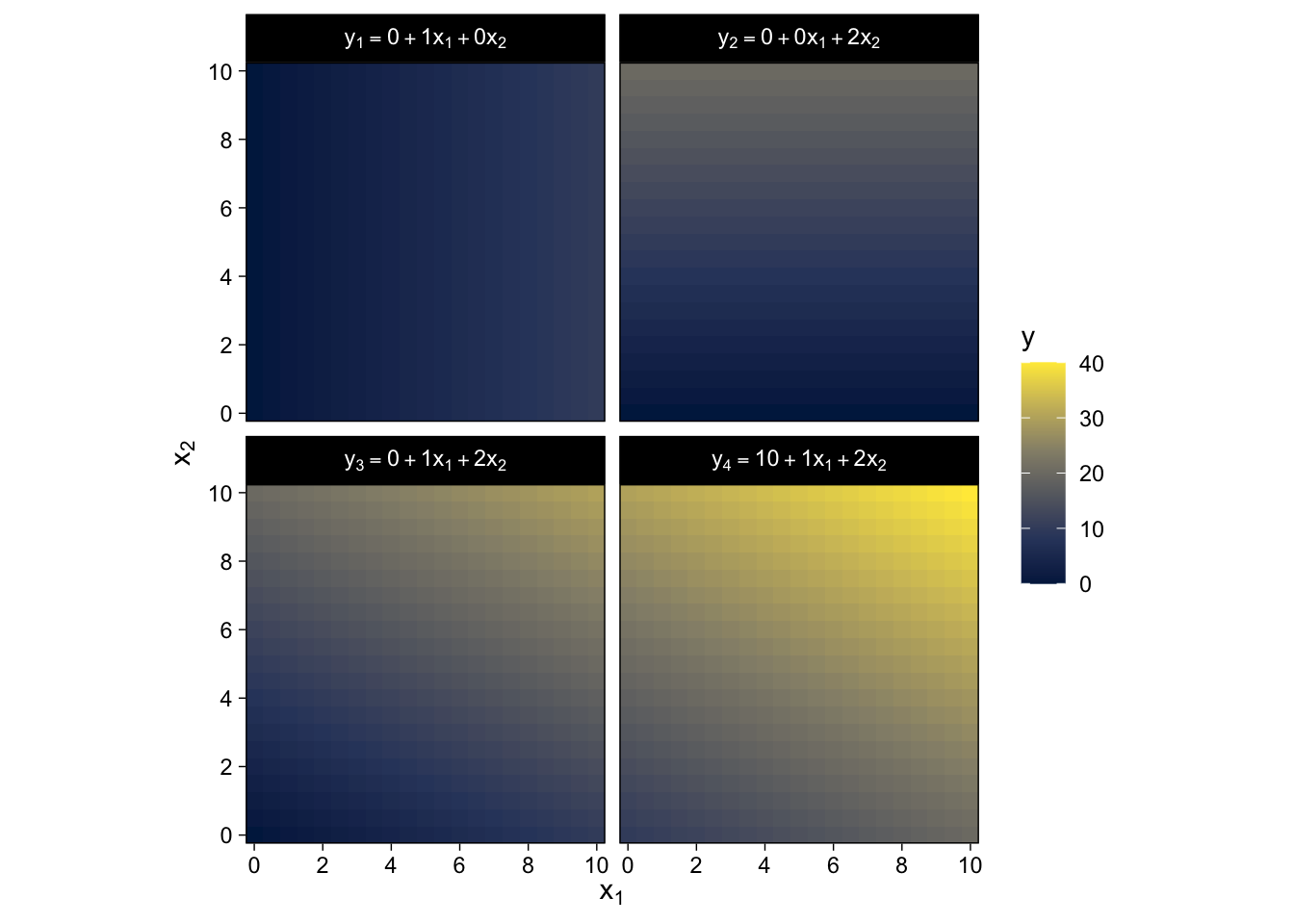 labs(subtitle = expression("y ~ N(m, sd=4), "*m==10+1*x[1]+2*x[2])) +