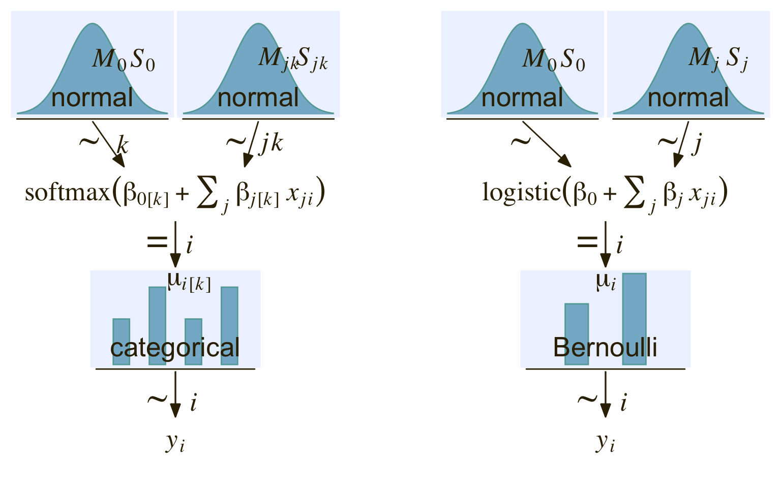 for which the subscripts \(k\) indicate there’s a linear model for each of the \(k\) categories. We call the possible set of \(k\) outcomes \(S\). Taking the case where \(k = 3\), we’d have