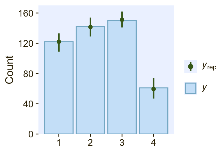 Though we used a different likelihood and a different formula for the thresholds, we got same basic model results. They’re just parameterized in a slightly different way. The nice thing with the family = sratio approach is all of the typical brms post processing functions will work out of the box. For example, here’s the posterior predictive check via pp_check().