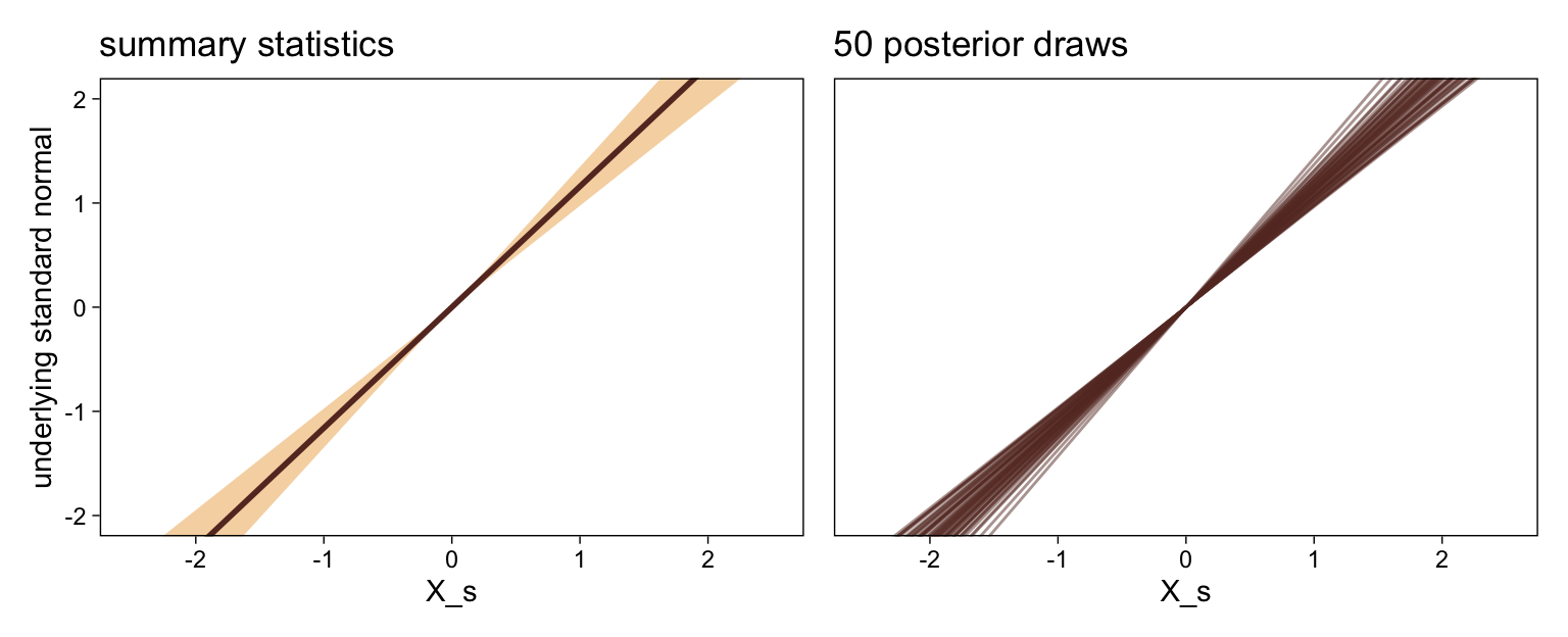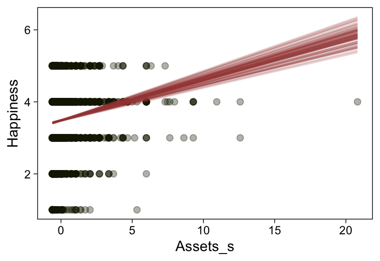 With brms, you can get this information with fitted(). Let’s say we wanted to focus on response probabilities for Assets_s = -1). Here’s what we get.