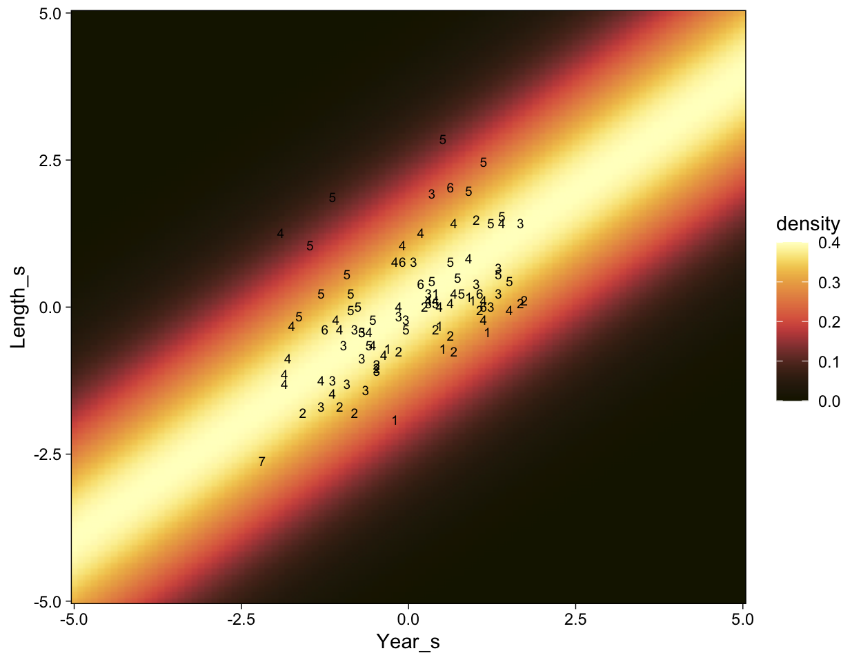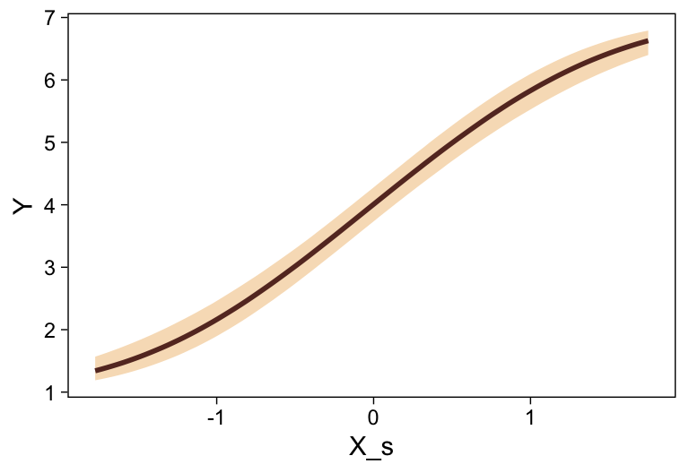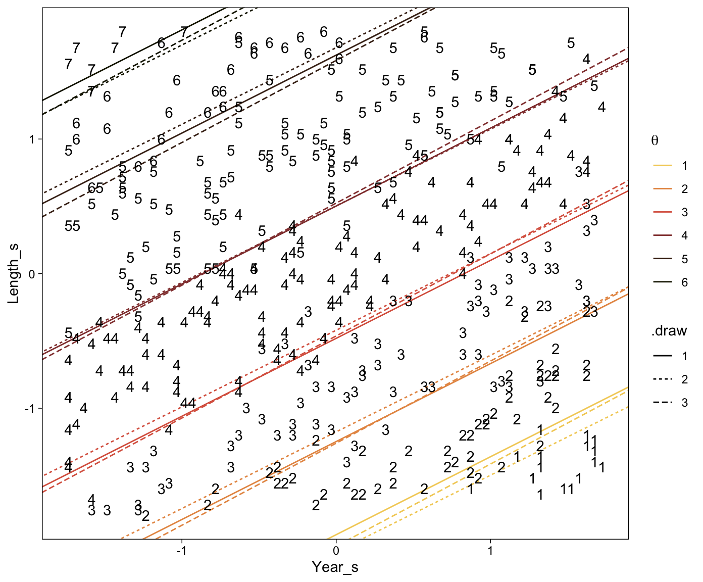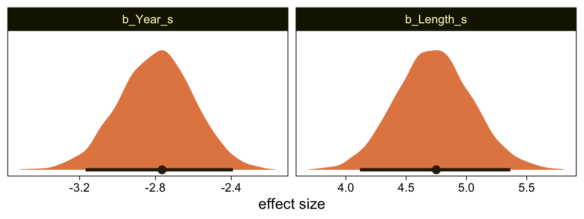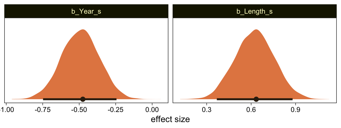 Because the model had two predictors, we got two plots. What brms::conditional_effects() called Probability on the \(y\)-axis is the same as what Kruschke called \(p(y)\) on his. Rather than generic predictors \(x\) on the \(x\)-axis, our plots had either Year_s or Length_s. Whereas Kruschke marked off his different outcomes by line styles, ours were marked by color. Since we don’t have the data Kruschke used to make Figure 23.11, we won’t be able to reproduce it exactly. However, you’ll note that our plot for Length_s corresponded nicely with his subplot on the top (i.e., the one for which \(\sigma = 0.1\)). If we set effects = "Length_s", we can use conditional_effects() to make a similar plot to Kruschke’s subplot for which \(\sigma = 1\).