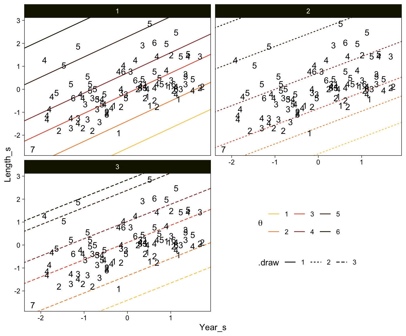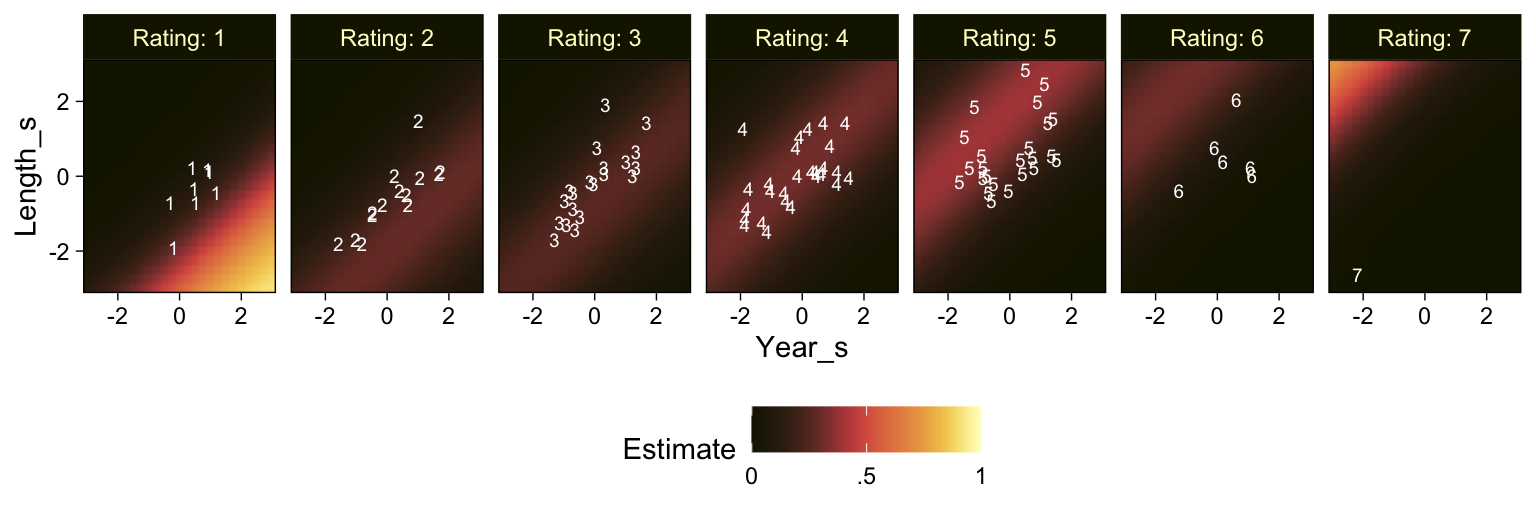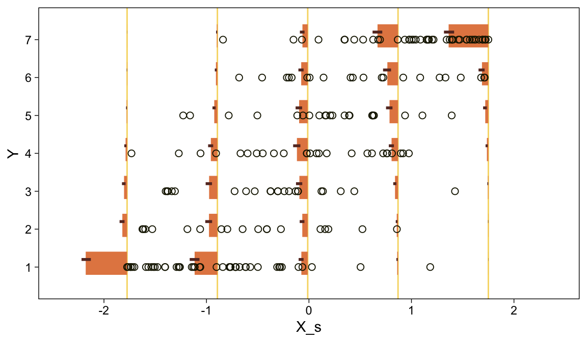 Those are some tight thresholds. They “very clearly cleave parallel regions of distinct ordinal values. The example demonstrates that the threshold lines do make intuitive sense when there is low noise and a broad range of data” (p. 695, emphasis in the original).