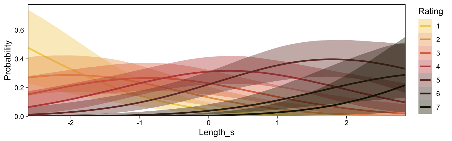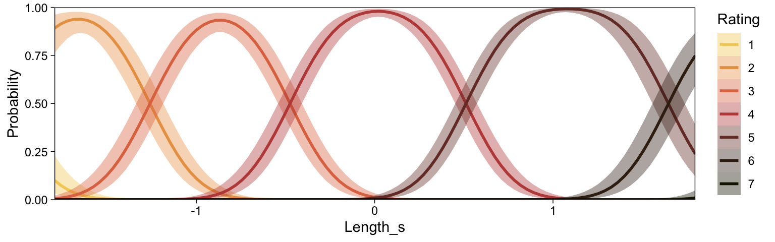 With our various bonus plots, we’ve been anticipating Figure 23.11 for some time, now. The thresholds from fit23.14 result in beautifully nonlinear probability curves for the Rating levels. Take a quick look with conditional_effects().
