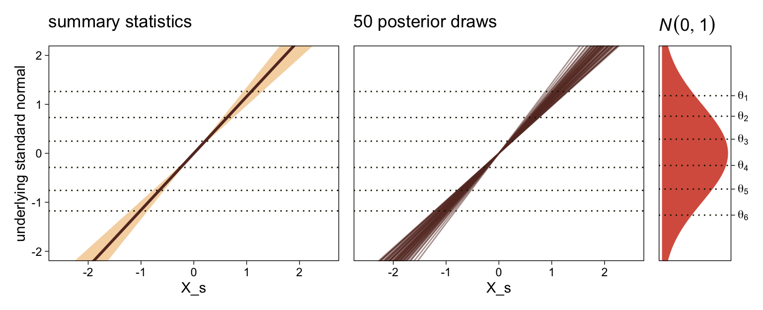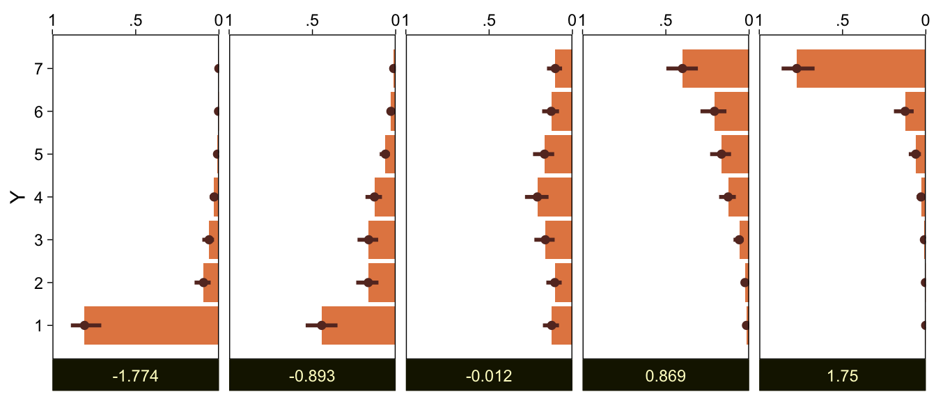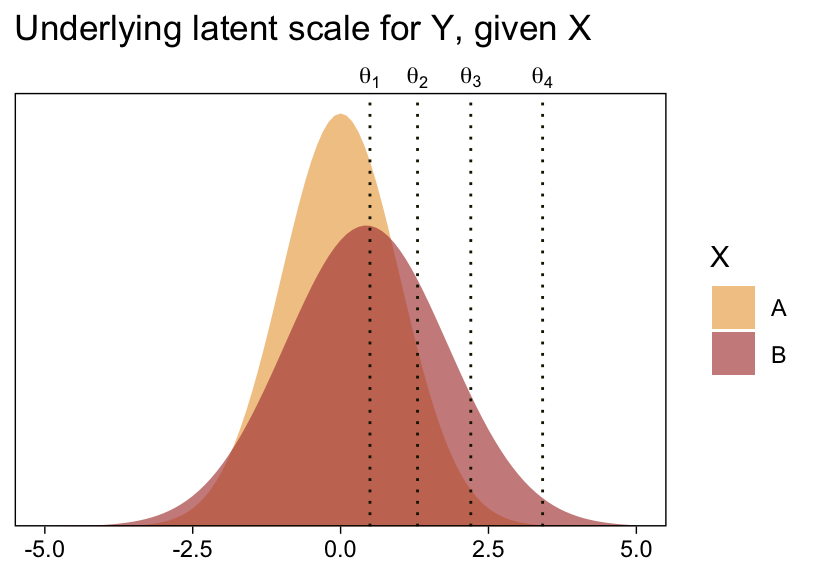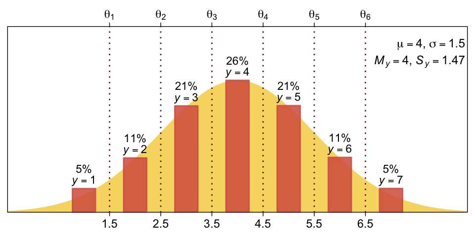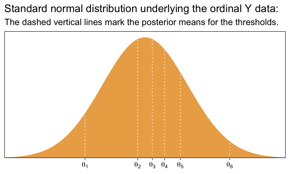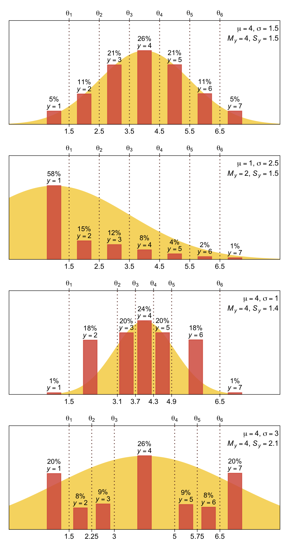 You can imagine that the distribution of ordinal values might not resemble a normal distribution, even though the underlying metric values are normally distributed. Figure 23.1 shows some examples of ordinal outcome probabilities generated from an underlying normal distribution. The horizontal axis is the underlying continuous metric value. Thresholds are plotted as vertical dashed lines, labeled \(\theta\). In all examples, the ordinal scale has \(7\) levels, and hence, there are \(6\) thresholds. The lowest threshold is set at \(\theta_1 = 1.5\) (to separate outcomes \(1\) and \(2\)), and the highest threshold is set at \(\theta_1 = 6.5\) (to separate outcomes \(6\) and \(7\)). The normal curve in each panel shows the distribution of underlying continuous values. What differs across panels are the settings of means, standard deviations, and remaining thresholds. (p. 672)