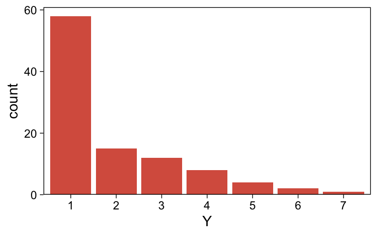 Next we can use count() and some follow-up mutate() lines to determine the proportion and percentage of each of the seven possible values in the y vector.