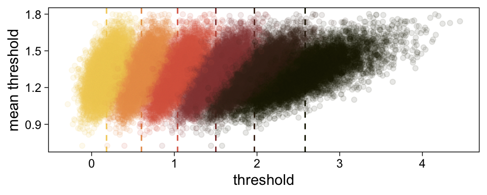 Extract the posterior draws and use compare_thresholds() to make our expanded version of the bottom panel of Figure 23.10.
