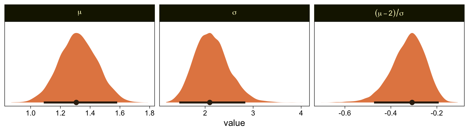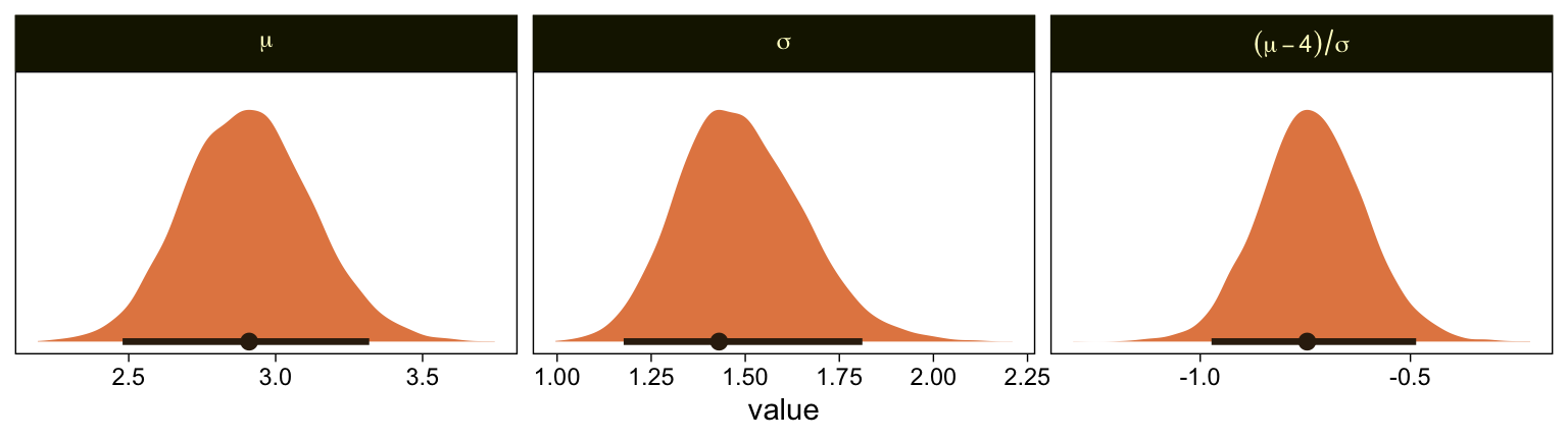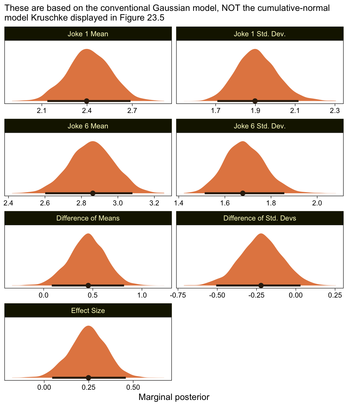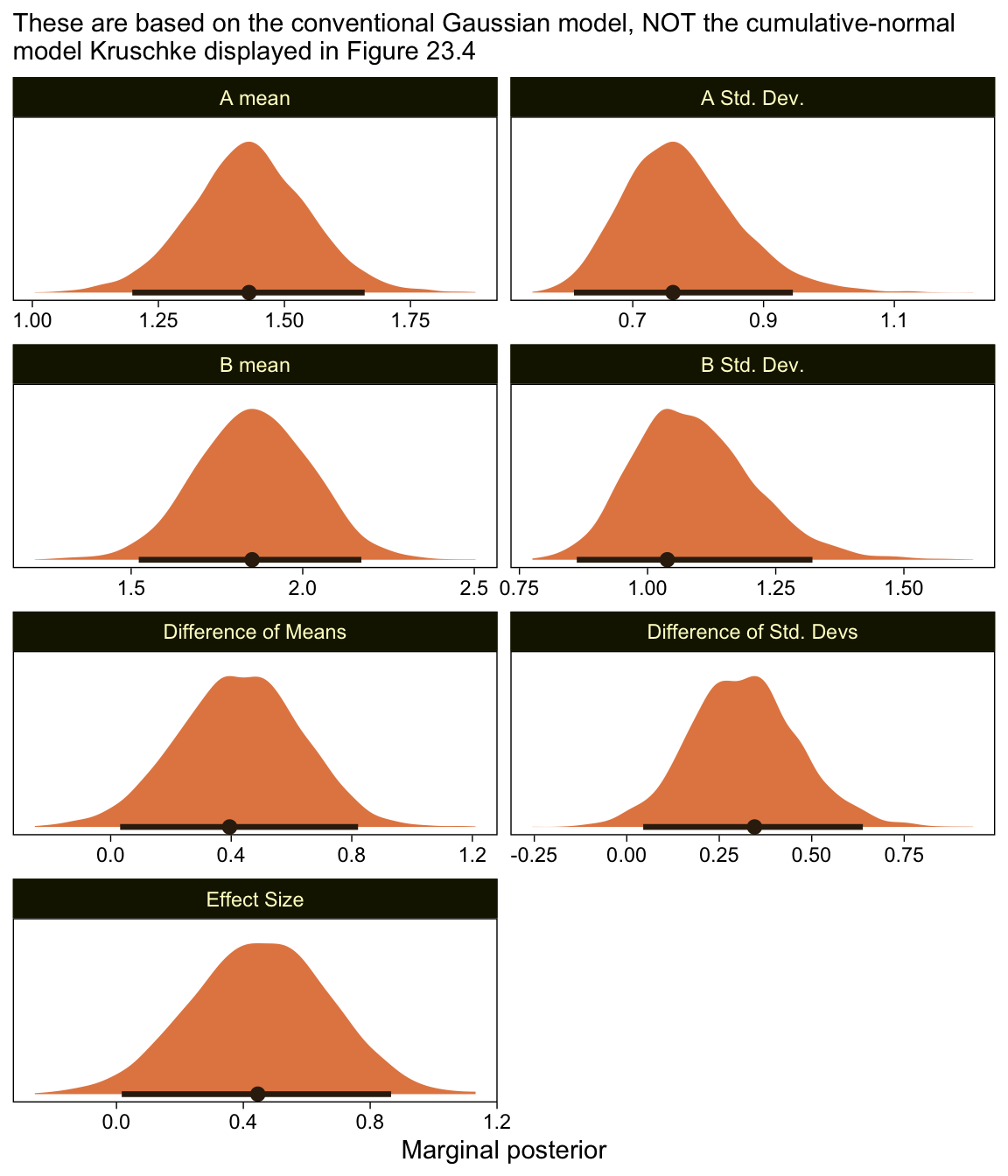 As is typical of brms, those probability summaries were in terms of the posterior mean and percentile-based 95% intervals. If you’re like Kruschke and prefer posterior modes and HDIs, you’ll need to set summary = F and wrangle a bit.