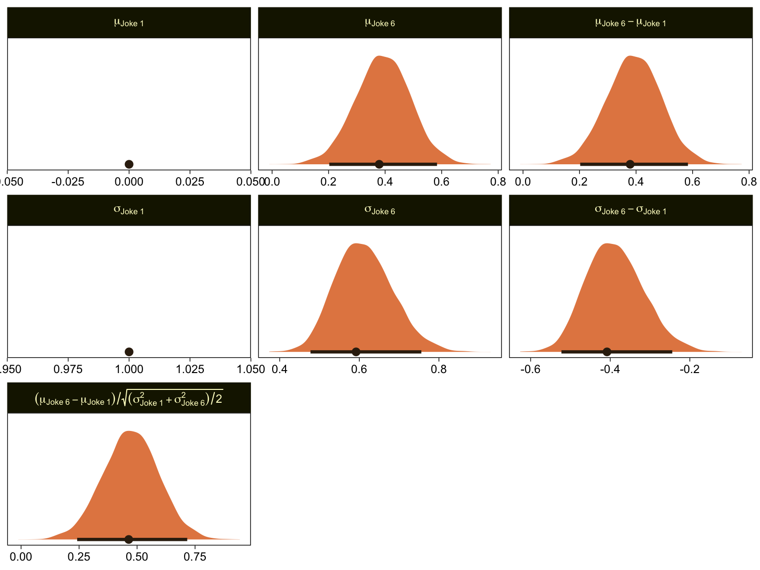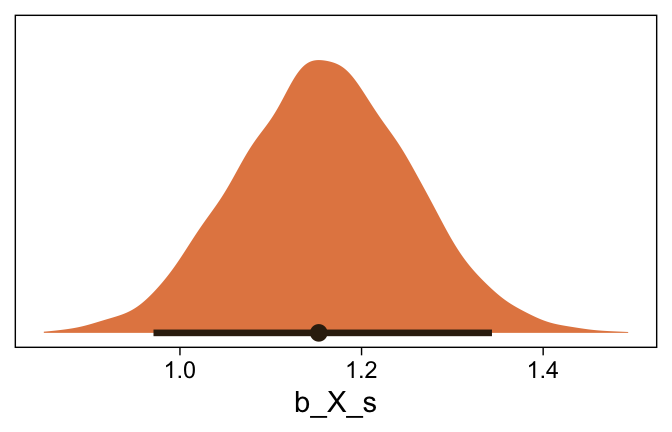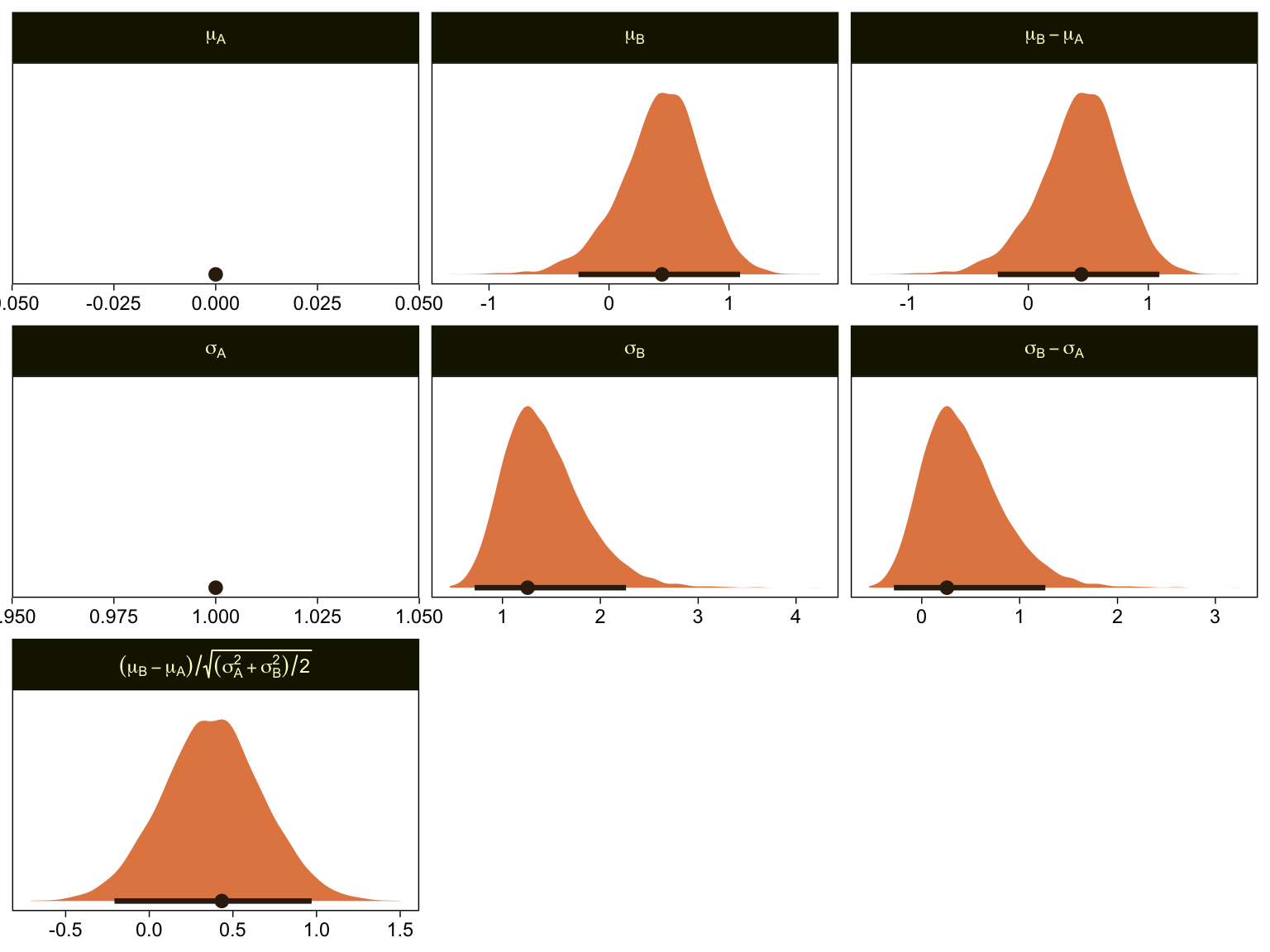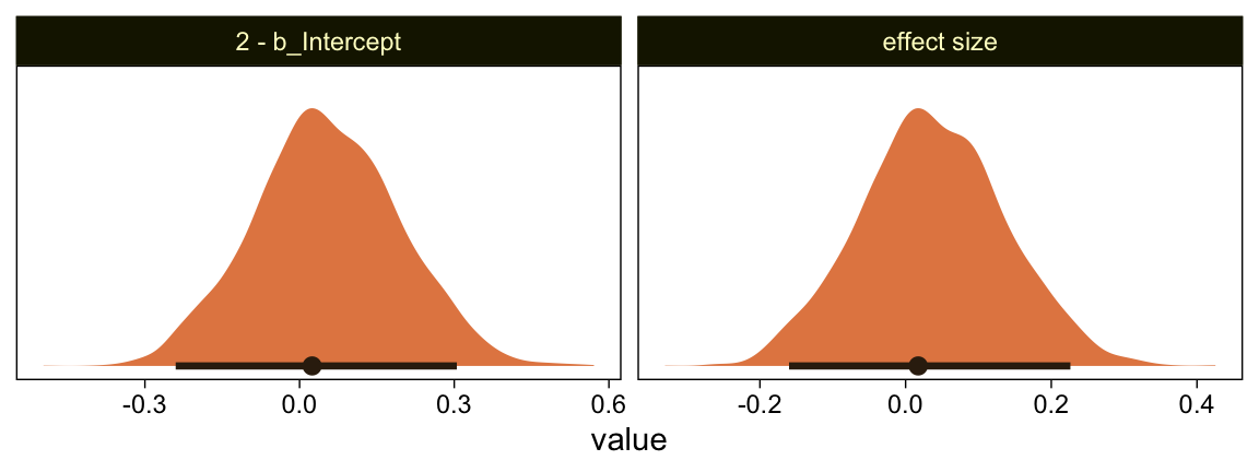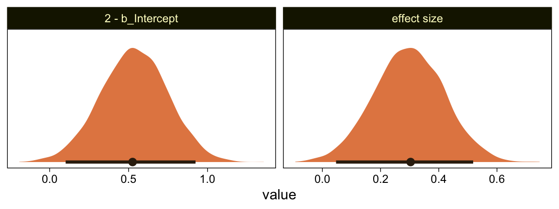 As is typical of brms, those probability summaries were in terms of the posterior mean and percentile-based 95% intervals. If you’re like Kruschke and prefer posterior modes and HDIs, you’ll need to set summary = F and wrangle a bit.