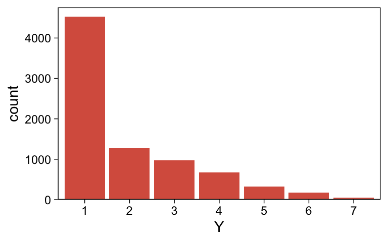 By default, the cut() function saved the bins with labels based on their upper and lower boundaries. To help define those boundaries, we nested the thresholds_1 values in between negative and positive infinity, which are the lower and upper bounds for the Gaussian range. However, it would be better if we labeled the bins with the integers 1 through 7, as in the text, which we can do with the labels argument. Though this will give the correct values, they will still be saved as a factor. As we will want these as integer values for some of the operations to come, we will convert those values with as.integer().