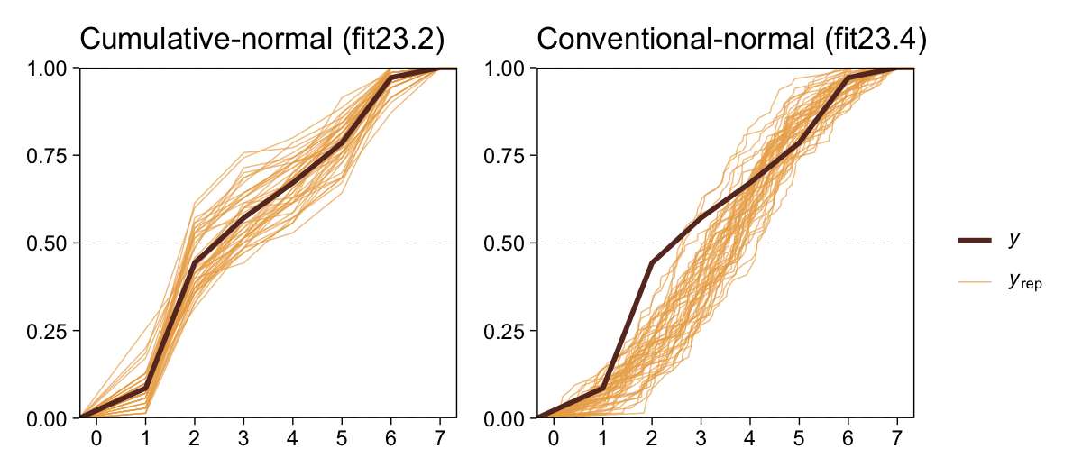 The cumulative-normal model makes posterior predictions for the probabilities of the \(K\) categories in the criterion variable by computing \(p (y \mid \mu (x), \sigma, \{ \theta_k \} )\) in each step in the HMC chain. In this equation, \(\mu (x) = \beta_0 + \sum_j \beta_j x_j\). Though recall that with our brms parameterization, we have \(\beta_0\) fixed at 0. Kruschke framed part of his discussion in this chapter in terms of a single-predictor model, such as was entertained in Figure 23.8. Recall that corresponds to our fit11. Here’s that formula.