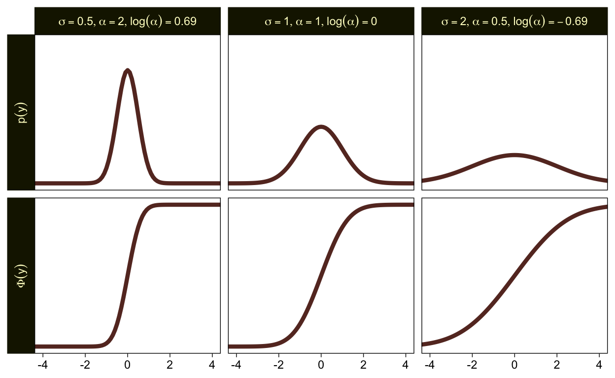 For both plots, z is in a standardized metric (i.e., \(z\)-score). With the cumulative normal function, the cumulative probability \(\Phi(z)\) increases nonlinearly with the \(z\)-scores such that, much like with the logistic curve, the greatest change occurs around \(z = 0\) and tapers off in the tails.