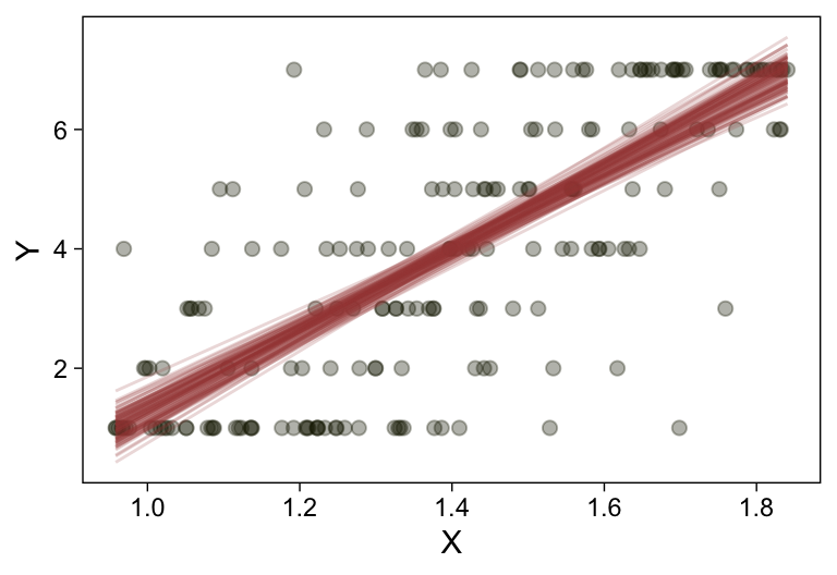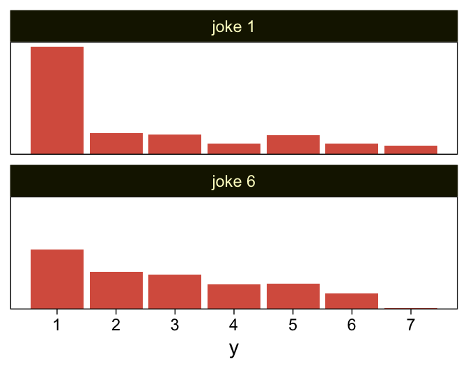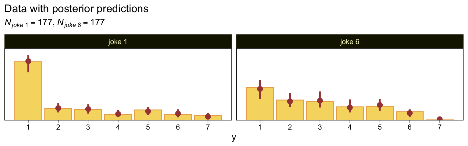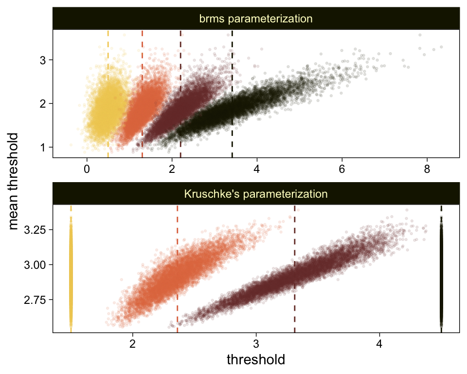 In this section, Kruschke mentioned extensions of this class of models might include using the cumulative \(t\) function to handle outliers or adding a guessing parameter. Full disclosure: I have not fit models like these. Based on my knowledge of brms, I suspect they’re possible. For insights how, you might review Bürkner’s (2022b) Define custom response distributions with brms and his (2022c) Estimating non-linear models with brms vignettes.