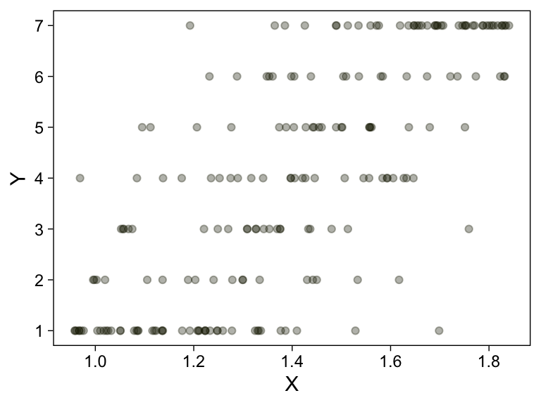 This chapter considers data that have an ordinal predicted variable. For example, we might want to predict people’s happiness ratings on a \(1\)-to-\(7\) scale as a function of their total financial assets. Or we might want to predict ratings of movies as a function of the year they were made.