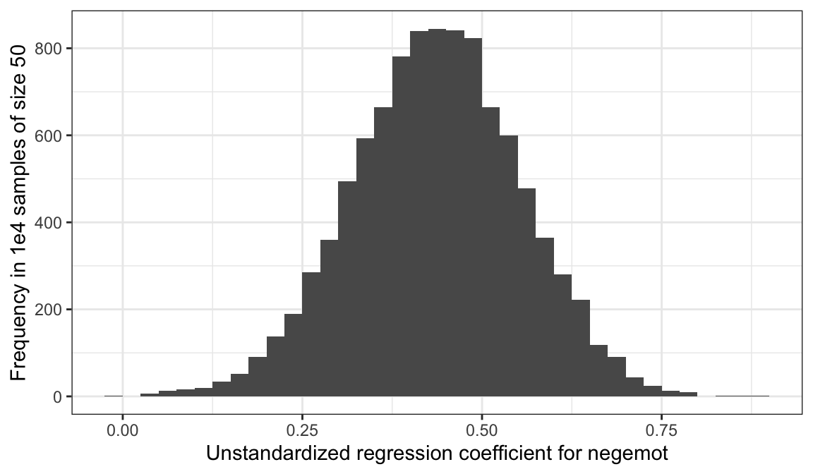 # we need an iteration index, which will double as the values we set our seed with in our `make_sample()` functiontibble(iter =1:1e4) %>%group_by(iter) %>%# inserting our subsamplesmutate(sample =map(iter, make_sample)) %>%# fitting our modelsmutate(model =map(sample, glbwarm_model)) %>%# taking those model results and tidying them with the broom packagemutate(broom =map(model, broom::tidy)) %>%# unnesting allows us to access our model resultsunnest(broom) %>%# we're only going to focus on the estimates for `negemot`filter(term =="negemot") %>%# here it is, Figure 2.7ggplot(aes(x = estimate)) +geom_histogram(binwidth =0.025, boundary =0) +labs(x ="Unstandardized regression coefficient for negemot",y ="Frequency in 1e4 samples of size 50") +theme_bw()