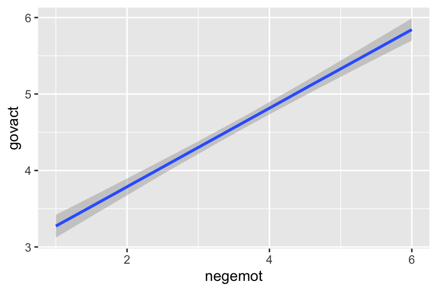 Next, we’ll use the fitted() function to compute model-implied summaries for the expected govact value, given particular predictor values. Our first model only has negemot as a predictor, and we’ll ask for the expected govact values for negemot ranging from 0 to 7.