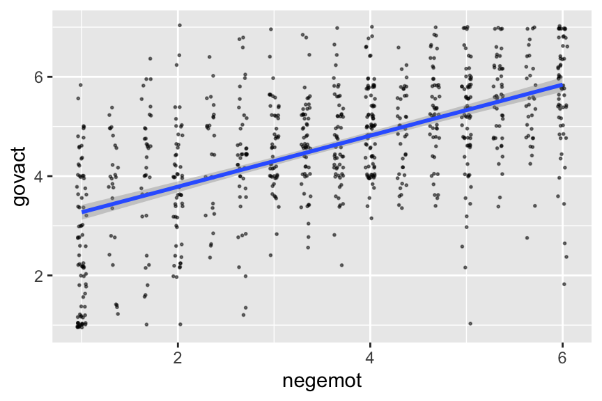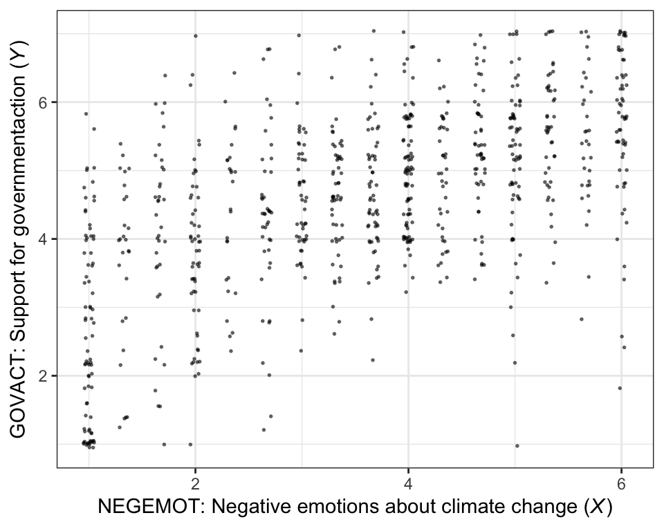 glbwarm %>%ggplot(aes(x = negemot, y = govact)) +geom_jitter(height =0.05, width =0.05, alpha =1/2, size =1/3) +labs(x =expression(paste("NEGEMOT: Negative emotions about climate change (", italic("X"), ")")),y =expression(paste("GOVACT: Support for governmentaction (", italic("Y"), ")"))) +theme_bw()