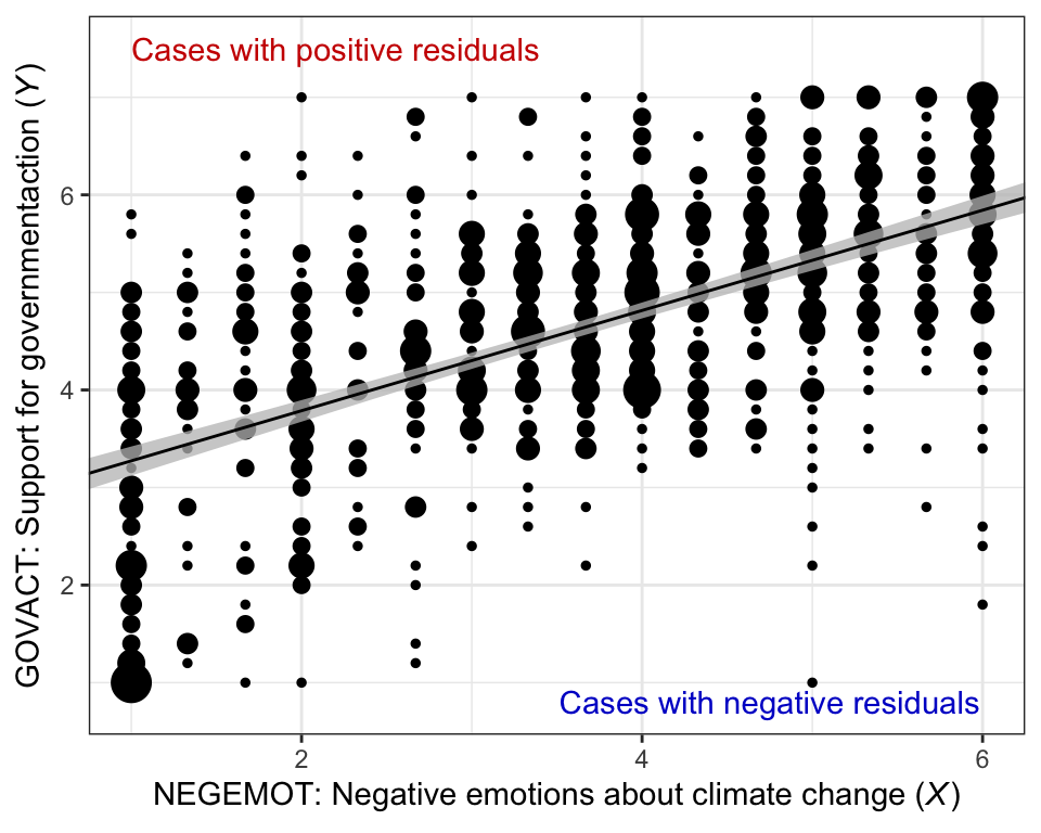 glbwarm %>%group_by(negemot, govact) %>%count() %>%ggplot(aes(x = negemot)) +geom_point(aes(y = govact, size = n),show.legend = F) +geom_ribbon(data = f,aes(ymin = Q2.5, ymax = Q97.5),fill ="grey75", alpha =3/4) +geom_line(data = f,aes(y = Estimate)) +annotate("text", x =2.2, y =7.5, label ="Cases with positive residuals", color ="red3") +annotate("text", x =4.75, y =0.8, label ="Cases with negative residuals", color ="blue3") +labs(x =expression("NEGEMOT: Negative emotions about climate change ("*italic("X")*")"),y =expression("GOVACT: Support for governmentaction ("*italic("Y")*")")) +coord_cartesian(xlim =range(glbwarm$negemot)) +theme_bw()