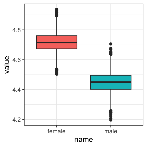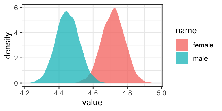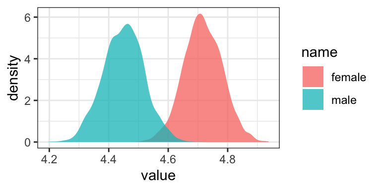 They match up well with the results in the middle of page 42. Now the Intercept in the output, what Hayes called \(i_Y\) is the unweighted mean of the means, \(\big (\overline Y_\text{male} + \overline Y_\text{female} \big ) \big / 2\), and the coefficient sex_recode (i.e., what Hayes called \(b\)) is one half the difference between those means. Here’s how to work with the posterior draws from this model to reproduce the group mean estimates.