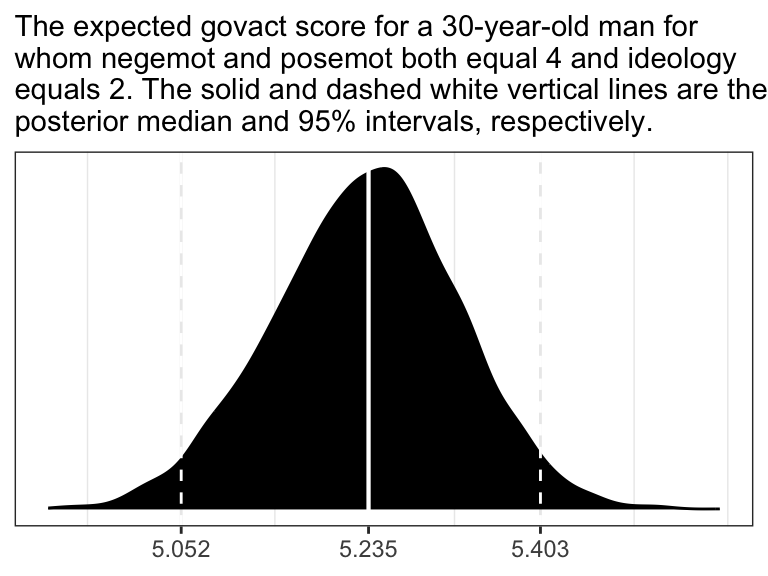 Finally, because Bayesians aren’t bound to the NHST paradigm, we aren’t bound to 95% intervals, either. For example, in both his excellent (2020)text and as a default in its accompanying rethinking package, Richard McElreath often uses 89% intervals. Alternatively, Andrew Gelman has publicly advocated for 50% intervals. The most important thing is to express the uncertainty in the posterior in a clearly-specified way. If you’d like, say, 80% intervals in your model summary, you can insert a prob argument into either print() or summary().