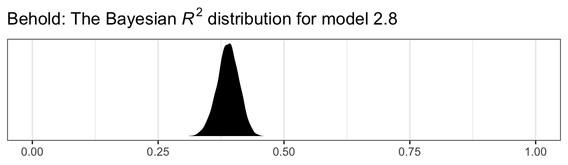 bayes_R2(model2.8, summary = F) %>%data.frame() %>%ggplot(aes(x = R2)) +geom_density(fill ="black", color ="transparent") +scale_y_continuous(NULL, breaks =NULL) +labs(title =expression(paste("Behold: The Bayesian ", italic("R")^{2}, " distribution for model 2.8")),x =NULL) +coord_cartesian(xlim =0:1) +theme_bw()
