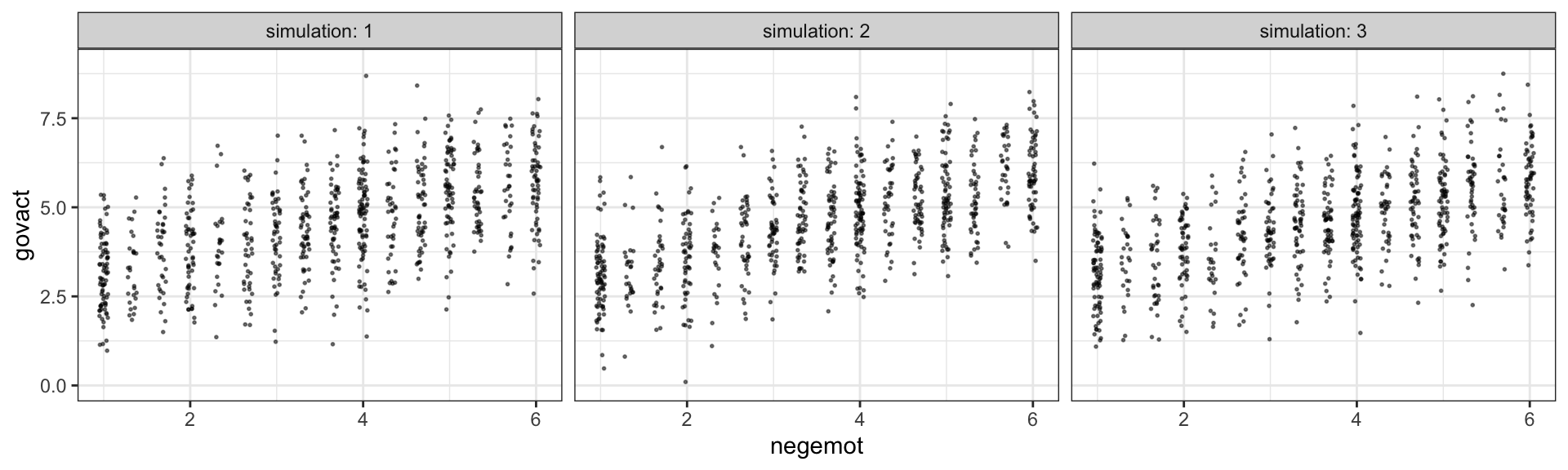 Overall, the simulations aren’t bad. But in all three govact tends to veer above 7.5, which is where the original data appear to be bounded. But otherwise the overall shape is pretty close, at least with respect to negemot.