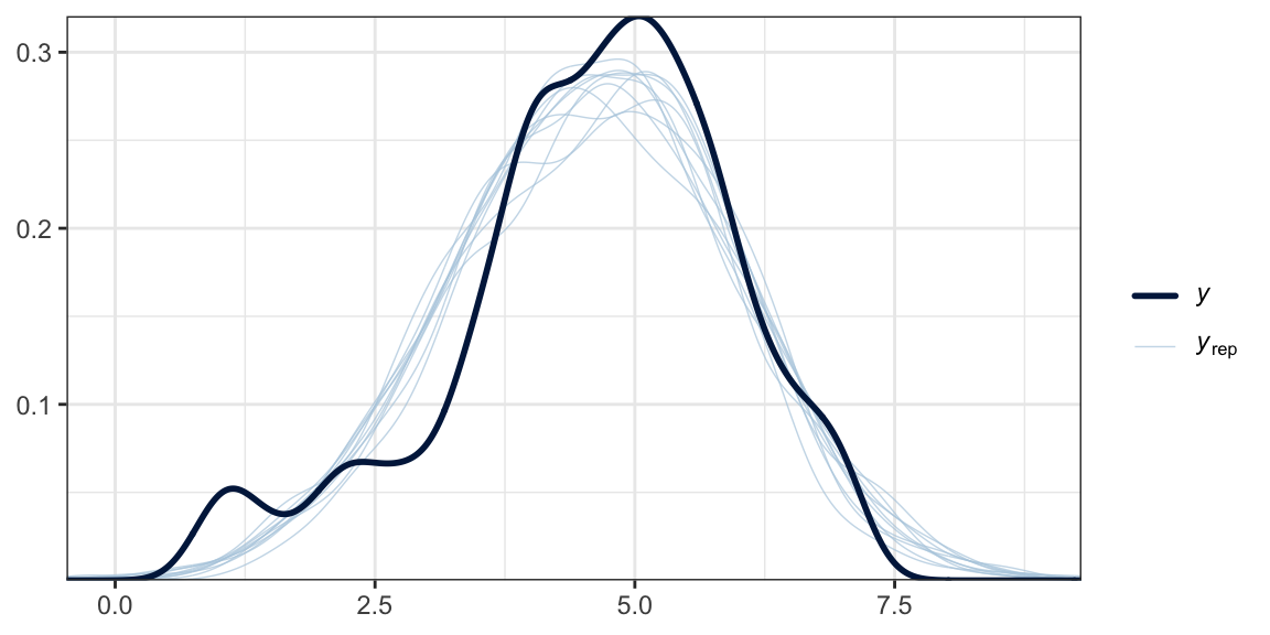 Another method is with the brms::pp_check() function, which allows users to access a variety of convenience functions from the bayesplot package(Gabry et al., 2019; Gabry & Mahr, 2022). Here we’ll use the default settings and just tack on theme_bw() for aesthetics.