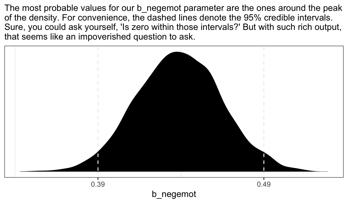 as_draws_df(model2.8) %>%ggplot(aes(x = b_negemot)) +geom_density(fill ="black", color ="transparent") +geom_vline(xintercept =posterior_interval(model2.8)["b_negemot", ],color ="white", linetype =2) +scale_x_continuous(breaks =posterior_interval(model2.8)["b_negemot", ] %>%as.double(),labels =posterior_interval(model2.8)["b_negemot", ] %>%as.double() %>%round(digits =2) %>%as.character()) +scale_y_continuous(NULL, breaks =NULL) +labs(subtitle ="The most probable values for our b_negemot parameter are the ones around the peak\nof the density. For convenience, the dashed lines denote the 95% credible intervals.\nSure, you could ask yourself, 'Is zero within those intervals?' But with such rich output,\nthat seems like an impoverished question to ask.") +theme_bw()