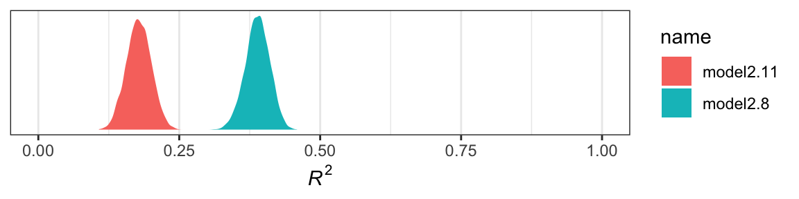 Yep, the \(R^2\) distribution for model2.8, the one including the emotion variables, is clearly larger than that for the more parsimonious model2.11. And it’d just take a little more data wrangling to get a formal \(R^2\) difference score.