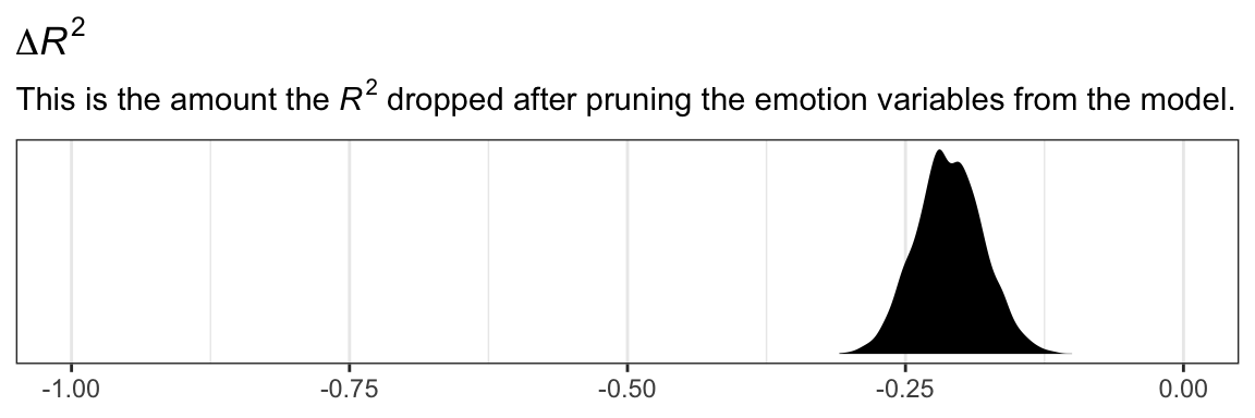 r2 %>%mutate(difference = model2.11- model2.8) %>%ggplot(aes(x = difference)) +geom_density(fill ="black", color ="transparent") +scale_y_continuous(NULL, breaks =NULL) +coord_cartesian(xlim =-1:0) +labs(title =expression(paste(Delta, italic(R)^{2})),subtitle =expression(paste("This is the amount the ", italic(R)^{2}, " dropped after pruning the emotion variables from the model.")),x =NULL) +theme_bw()