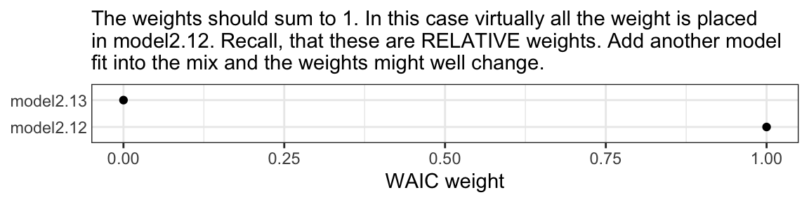 mw %>%data.frame() %>%rownames_to_column() %>%set_names(c("model", "WAIC weight")) %>%ggplot(aes(x =`WAIC weight`, y = model)) +geom_point() +labs(subtitle ="The weights should sum to 1. In this case virtually all the weight is placed\nin model2.12. Recall, that these are RELATIVE weights. Add another model\nfit into the mix and the weights might well change.", y =NULL) +theme_bw() +theme(axis.ticks.y =element_blank())