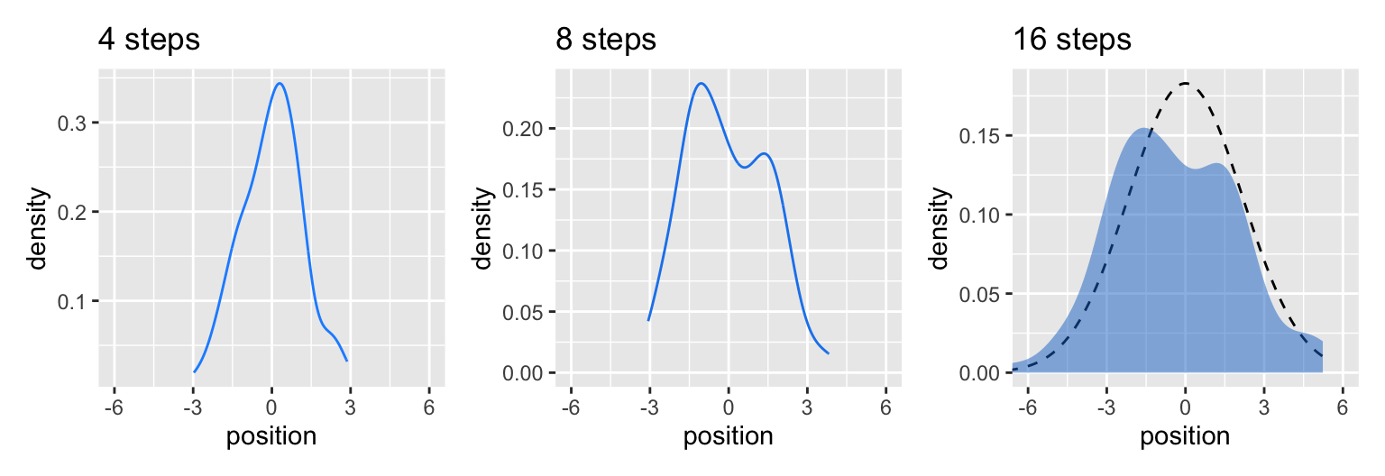 It’s hard to say where any individual person will end up, but you can say with great confidence what the collection of positions will be. The distances will be distributed in approximately normal, or Gaussian, fashion. This is true even though the underlying distribution is binomial. It does this because there are so many more possible ways to realize a sequence of left-right steps that sums to zero. There are slightly fewer ways to realize a sequence that ends up one step left or right of zero, and so on, with the number of possible sequences declining in the characteristic bell curve of the normal distribution. (p. 72)