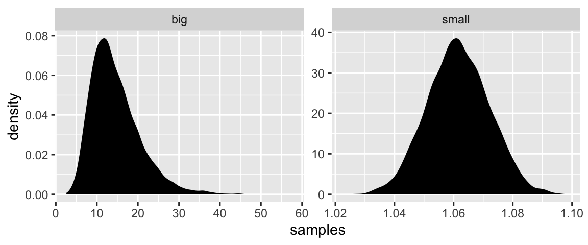 samples <- tibble(big = map_dbl(1:10000, ~ prod(1 + runif(12, 0, 0.5))),