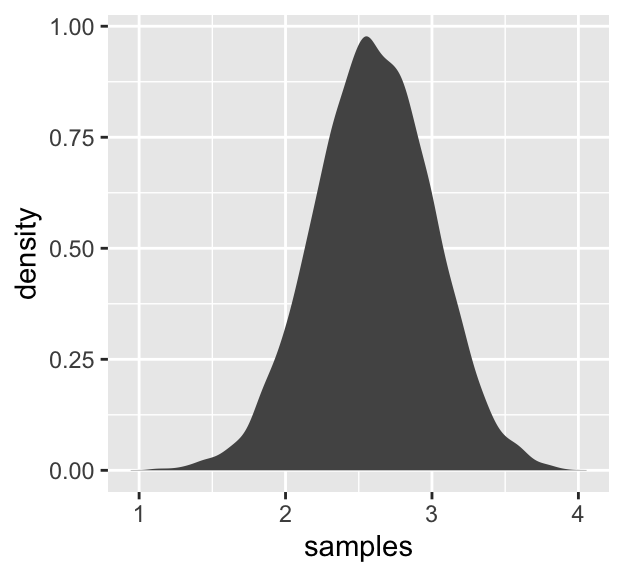 tibble(samples = map_dbl(1:1e4, ~ log(prod(1 + runif(12, 0, 0.5))))) %>%