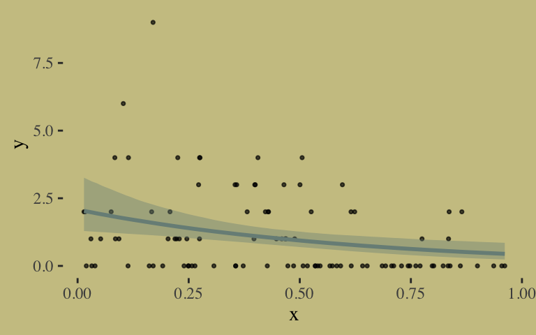 y <- rgeom(n, prob = plogis(-1 + 2 * x))In case you’re curious, here are the data.