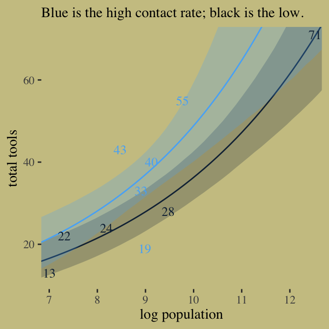 This chapter described some of the most common generalized linear models, those used to model counts. It is important to never convert counts to proportions before analysis, because doing so destroys information about sample size. A fundamental difficulty with these models is that the parameters are on a different scale, typically log-odds (for binomial) or log-rate (for Poisson), than the outcome variable they describe. Therefore computing implied predictions is even more important than before. (pp. 328–329)