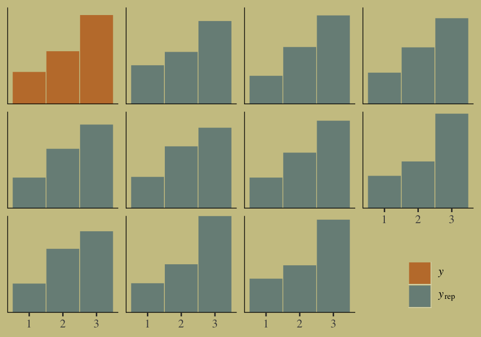 where \(y\) is some count variable, \(n\) is the number of trials, and \(p\) it the probability a given trial was a 1, which is sometimes termed a success. When \(n = 1\), then \(y\) is a vector of 0s and 1s. Presuming the logit link, which we just covered in Section 9.2.2, models of this type are commonly termed logistic regression. When \(n > 1\), and still presuming the logit link, we might call our model an aggregated logistic regression model, or more generally an aggregated binomial regression model.