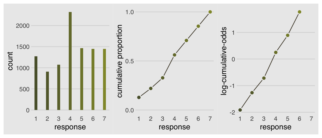 It is very common in the social sciences, and occasional in the natural sciences, to have an outcome variable that is discrete, like a count, but in which the values merely indicate different ordered levels along some dimension. For example, if I were to ask you how much you like to eat fish, on a scale from 1 to 7, you might say 5. If I were to ask 100 people the same question, I’d end up with 100 values between 1 and 7. In modeling each outcome value, I’d have to keep in mind that these values are ordered because 7 is greater than 6, which is greater than 5, and so on. But unlike a count, the differences in values are not necessarily equal.