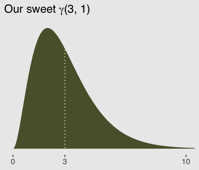 But what if you wanted to use the base R dgamma() function instead of McElreath’s rethinking::dgamma2()? Well, the dgamma() function parameterizes the gamma density in terms of shape and scale, following the equation