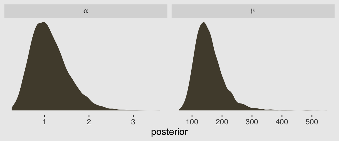 where \(\alpha\), \(e\), and \(\Gamma\) are all as they were before and \(\beta\) is the rate parameter. Let’s say we wanted to use the \(\operatorname{Gamma}(y \mid \alpha, \theta)\) parameterization with the dgamma() function. Here are the posterior means for our \(\alpha\) and \(\theta\) parameters.
