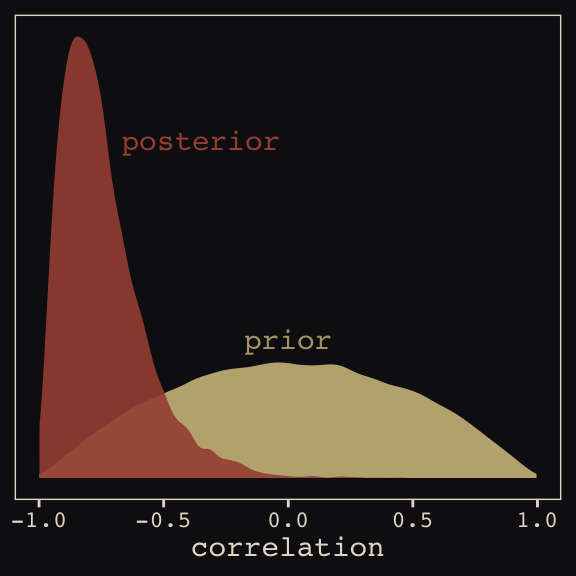 McElreath discussed how researchers might use other multivariate distributions to model multiple random effects. The only one he named as an alternative to the Gaussian was the multivariate Student’s \(t\). As it turns out, brms does currently allow users to use multivariate Student’s \(t\) in this way. For details, check out this discussion from the brms GitHub repository. Bürkner’s exemplar syntax from his comment on May 13, 2018, was y ~ x + (x | gr(g, dist = "student")). I haven’t experimented with this, but if you do, do consider sharing how it went.