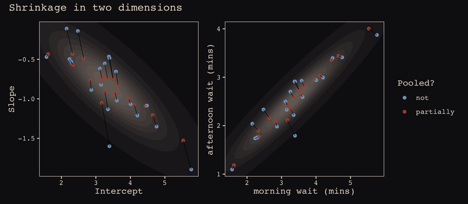 How should the robot pool information across intercepts and slopes? By modeling the joint population of intercepts and slopes, which means by modeling their covariance. In conventional multilevel models, the device that makes this possible is a joint multivariate Gaussian distribution for all of the varying effects, both intercepts and slopes. So instead of having two independent Gaussian distributions of intercepts and of slopes, the robot can do better by assigning a two-dimensional Gaussian distribution to both the intercepts (first dimension) and the slopes (second dimension). (p. 389)